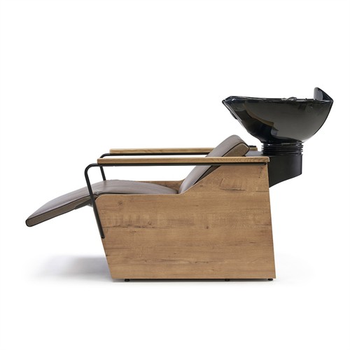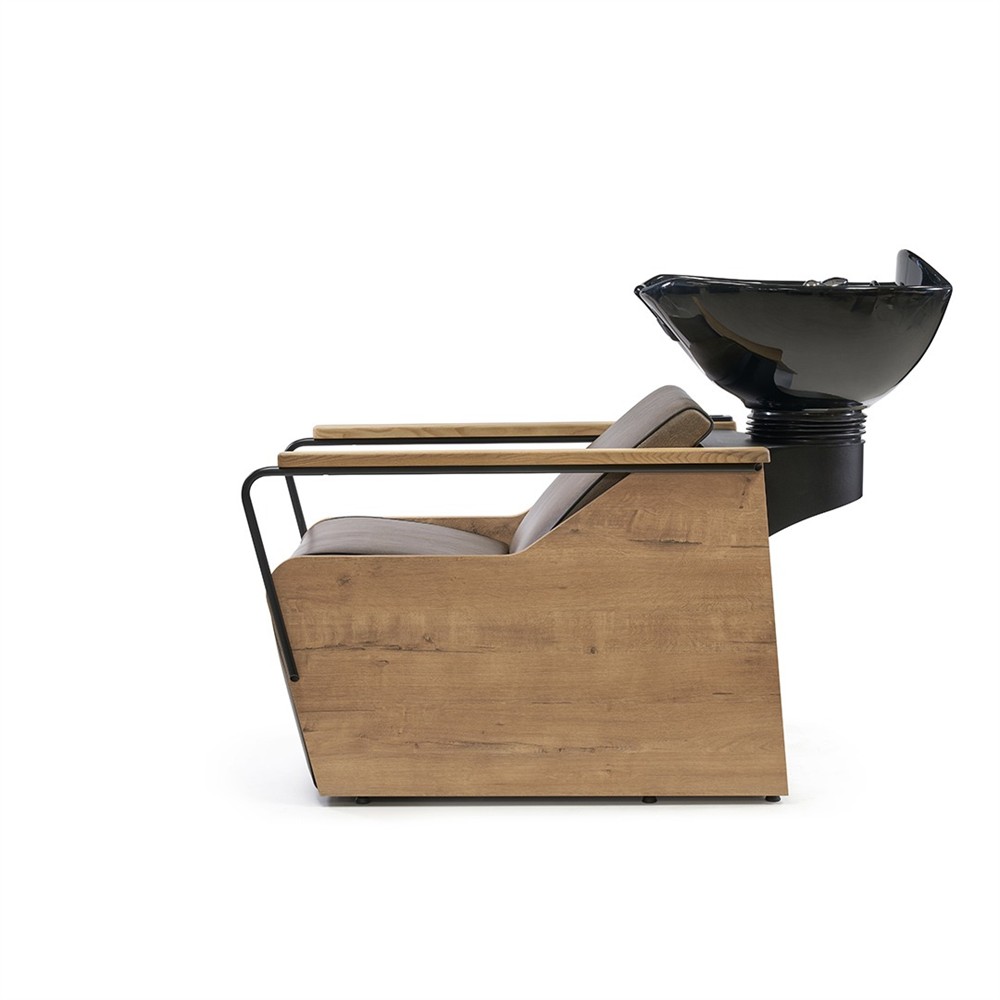 Sitsen är tillverkad av formstabilt trä, rikligt vadderad med expanderad polyuretan och klädd i slitstarkt konstläder. De massiva, lackerade ekarmstöden och sidopanelerna i ekfinish skapar en varm och modern känsla – ett designuttryck som passar både exklusiva studios och trendiga citysalonger.