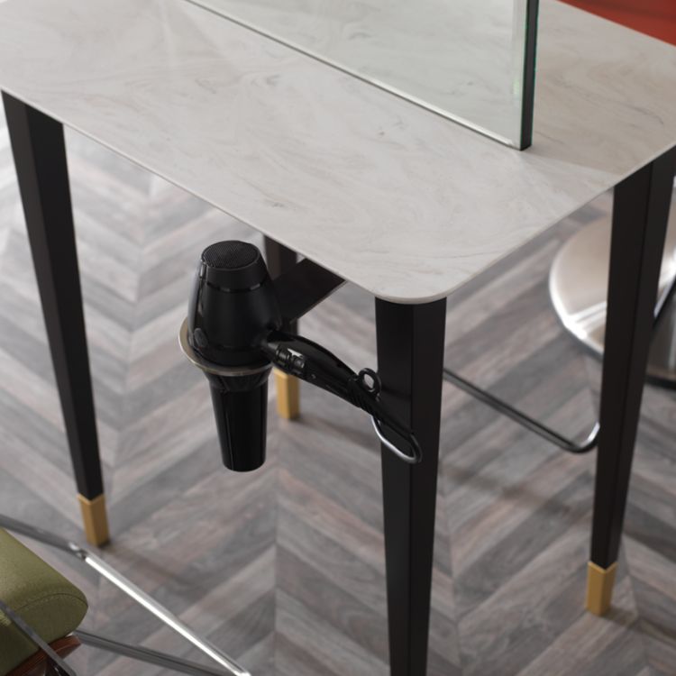 Arbetsstationen har marmorerade bänkskivor i vitt eller svart utförande, vilket gör det enkelt att anpassa uttrycket efter salongens koncept. Varje arbetsplats är utrustad med en integrerad, infällbar fönhållare som bidrar till en organiserad arbetsyta utan lösa verktyg.