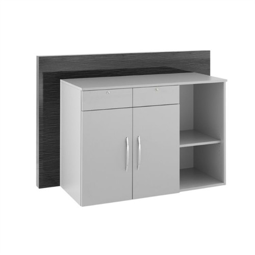 Baksida: Grå laminerad trästruktur med låsbara lådor