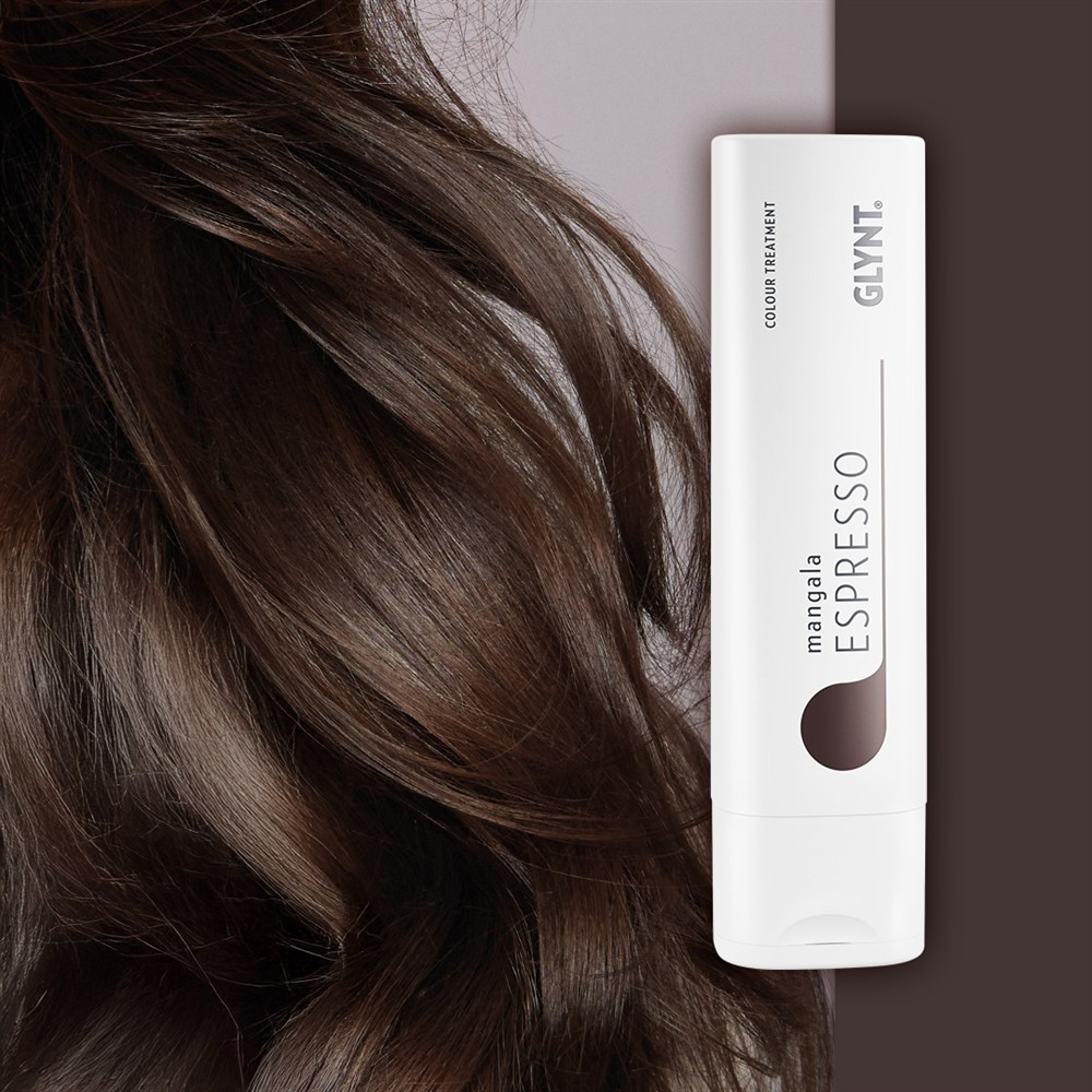 Glynt Mangala Espresso 200 ml är en färgförstärkande inpackning framtagen för att återställa glans, djup och ton i mörkbrunt, choklad- och brunsvart hår.Den ger en rik, intensiv glans och hjälper frisörer att erbjuda sina kunder mellanbehandlingar som förlänger färgresultatet.