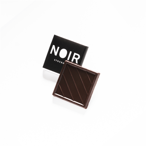 Den mörka chokladen är fint balanserad, med en len textur och rund kakaosmak som tilltalar både chokladälskare och designmedvetna kunder. Förpackningen i matt svart med vit NOIR-logotyp speglar samma renhet och estetik som NOIR Stockholms hårvårdsserie – tidlös, modern och lyxig.