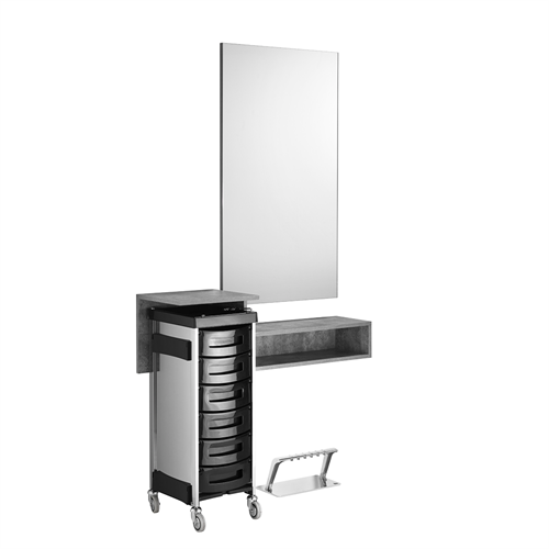 AGV arbetsbord Iris rek - Arbetsplats med rektangulär spegel. Designad för att ta upp minimalt med utrymme samtidigt som den erbjuder funktionell förvaring. Passar perfekt i salonger där utrymmet är begränsat och vägghängda stationer är att föredra. Utformad för att kombinera perfekt med AGV vagnar.