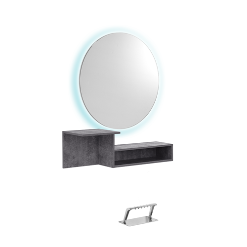 AGV arbetsbord Iris Tondo - Arbetsplats med rund spegel. Designad för att ta upp minimalt med utrymme samtidigt som den erbjuder funktionell förvaring. Passar perfekt i salonger där utrymmet är begränsat och vägghängda stationer är att föredra. Utformad för att kombinera perfekt med AGV vagnar.