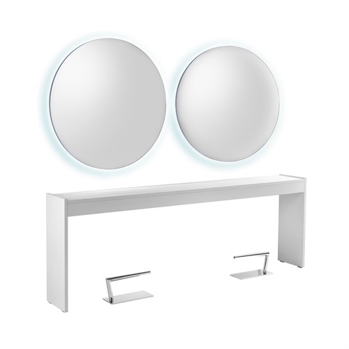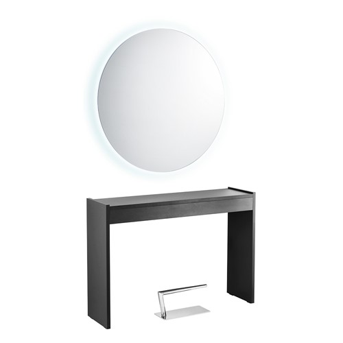 AGV Mariot arbetsbord - väggmonterad enhet med oval spegel, designad för att skapa en stilren och effektiv arbetsstation i salongen. Konstruktionen följer vår laminatkollektion, vilket säkerställer både hållbarhet och ett modernt utseende. Den dubbla designen ger flexibilitet och funktionalitet, vilket gör denna enhet till ett perfekt val för salonger som vill kombinera elegans med praktisk användning.