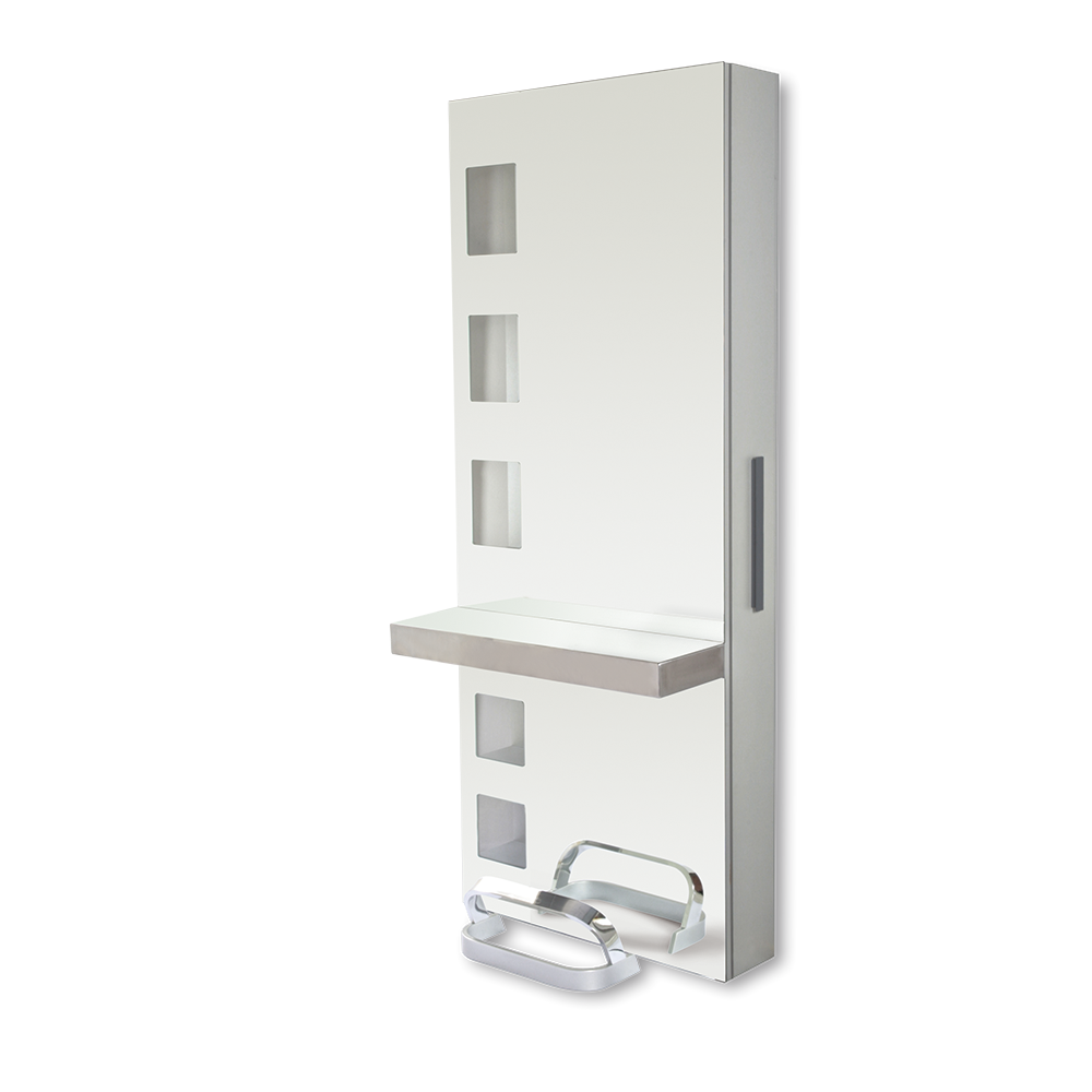 AGV arbetsbord Podio box - Podio Box från AGV är ett innovativt arbetsbord som kombinerar funktionalitet och stil för den moderna salongen. Multifunktionell väggmonterad enhet eller öenhet med stor spegel och hylla i rostfritt stål, display för stylingprodukter på vänster sida av spegeln. Förvaringsenhet som skjuts in i arbetsstationen, endast i öenheten.