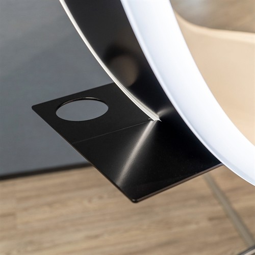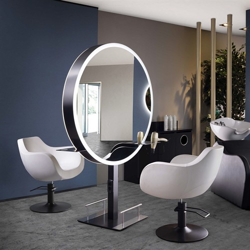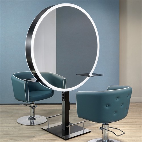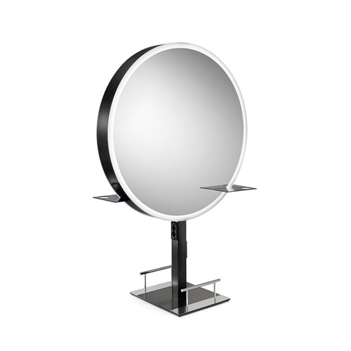 La Grace är en fristående, central spegel med LED-belysning. Utrustad med en hylla för hårfön, metallfot med eluttag och inbyggt fotstöd, vilket kombinerar funktionalitet med elegant design.