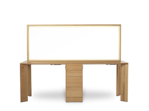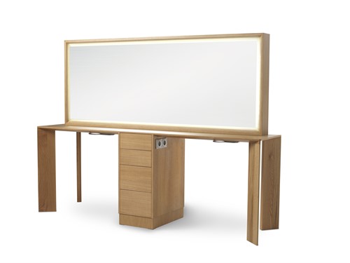 Takara Belmont Alvis Dio - är en elegant och modern tvåpositions arbetsstation designad av Takara Belmont, perfekt för en samtida salong. Den har en bakbelyst spegel omgiven av LED-belysning, vilket tillför både funktionalitet och en känsla av elegans. Stationen inkluderar ett centralt förvaringsskåp, två integrerade hårfönhållare och fyra eluttag, vilket säkerställer att alla dina verktyg finns nära till hands.