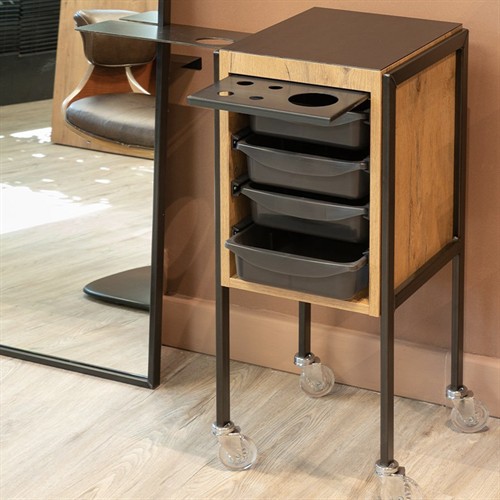 Coney Island-arbetsbord, en del av New York New York-kollektionen, är ett oumbärligt verktyg för varje professionell som värdesätter kvalitet utan kompromisser. Med sin industriella design har den en stomme i ek- och järneffekt-melamin, utformad för att erbjuda både praktisk användning och funktionalitet. Coney Island är utrustad med en utdragbar hållare för hårtork, ett stöd för plattänger och fyra rymliga brickor för förvaring av verktyg. De smidiga Speedy-hjulen ger full rörlighet och gör det enkelt att flytta vagnen vid behov. Ett tillbehör som förenar estetik, hållbarhet och funktionalitet.