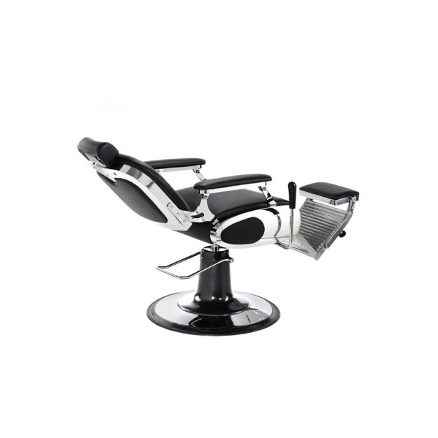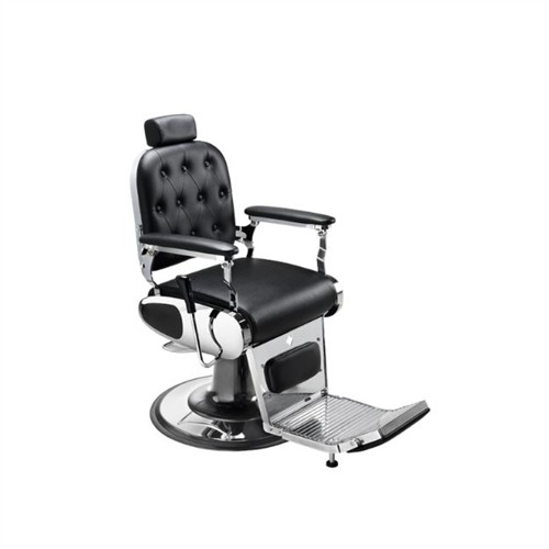 Stolen erbjuder ryggstöd som kan fällas bakåt för extra komfort vid rakning och behandlingar. Den eleganta designen med tuftad rygg, kromade detaljer och generös fotplatta förstärker stolens tidlösa uttryck.
