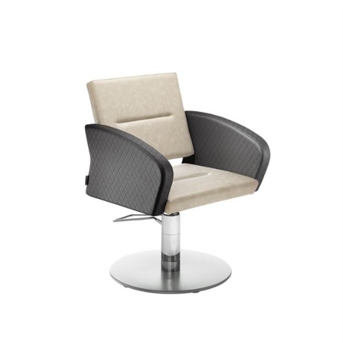 De karaktäristiska armstöden i diamantmönstrad läderklädsel ger stolen en exklusiv känsla och skapar ett stilrent uttryck som passar både moderna och klassiska salonger. Den lätta lutningen i rygg och sits säkerställer en avslappnad hållning, medan den hydrauliska pumpen gör höjdjustering enkel och smidig.