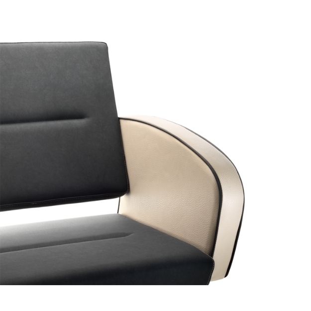 Den tvåfärgade klädseln, diamantpräglad struktur på armstödens utsida och de rena linjerna skapar ett exklusivt uttryck som lyfter helheten i både klassiska och moderna salonger.