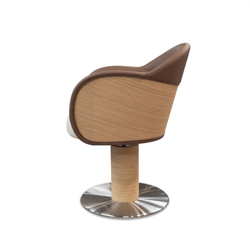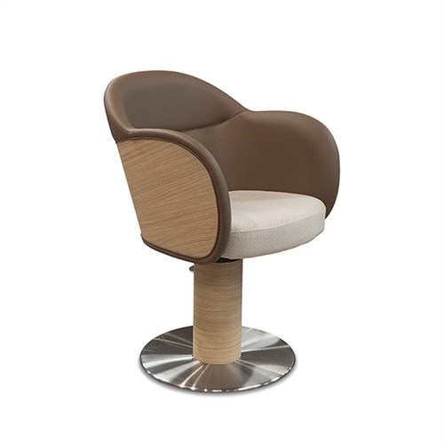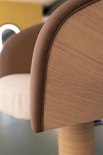 För ryggstödet i trä erbjuds tre raffinerade träslag: ljus ek, mörk ek och valnöt. Klädseln finns i ett brett urval av färgkombinationer, inklusive de nya miljövänliga skay-materialen som presenteras i tre färgvarianter.