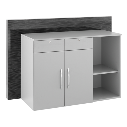 Tillverkad i laminerat trä enligt färgkarta erbjuder Allure en valbar framsida i trä, spegel eller imitationsläder, vilket gör det enkelt att anpassa receptionen efter din inredning. Den grå baksidan i laminerat trä är försedd med låsbara lådor, vilket säkerställer både trygg förvaring och en organiserad arbetsyta. LED-kit finns som tillval för en sofistikerad ljuseffekt som lyfter helhetsintrycket.