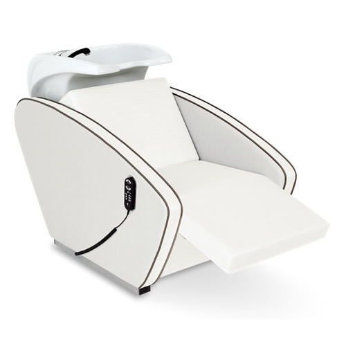 AGV schamponeringsstation Milos - Är en högkvalitativ tvättstol med ett keramiskt handfat och finns i tre funktioner: standard, relax och massage. Stolen är utformad för att erbjuda maximal komfort med minnesskum och är fullt justerbar. Det är en elegant och funktionell enhet som kombinerar italiensk design med komfort och stil.