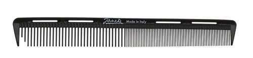 En flexibel och slitstark klippkam från Jäneke med praktisk sektioneringstand, perfekt för precision och enkel sektionering vid klippning och styling. Kammen är handgjord i norra Italien av material av högsta kvalitet och är i det närmaste oförstörbar – den tål både värme och daglig, tuff användning utan att förlora form eller funktion. De mjukt rundade tänderna är noggrant kontrollerade för att aldrig vara vassa, vilket gör kammen skonsam mot både hår och hårbotten. Perfekt för både professionella frisörer och hemmabruk.